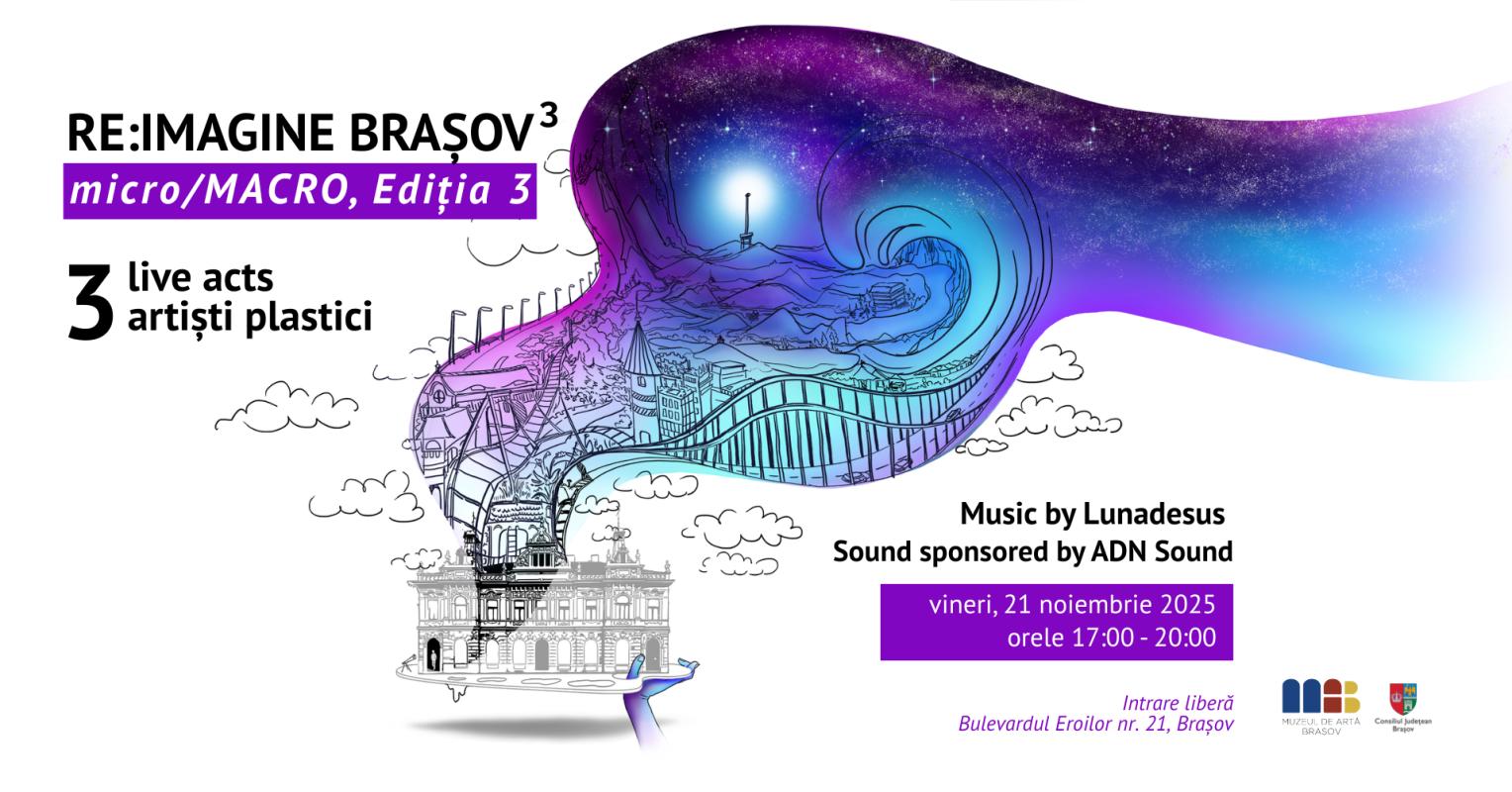 Al treilea și ultimul eveniment al acestui an din seria Re:Imagine Brașov – micro/MACRO va avea loc vineri, 21 noiembrie 2025, între orele 17:00- 20:00, la sediul Muzeului de Artă Brașov din Bulevardul Eroilor nr. 21. Sălile muzeului se vor transforma în spațiu de creație, atelier pentru artiști și cadru pentru discuții.