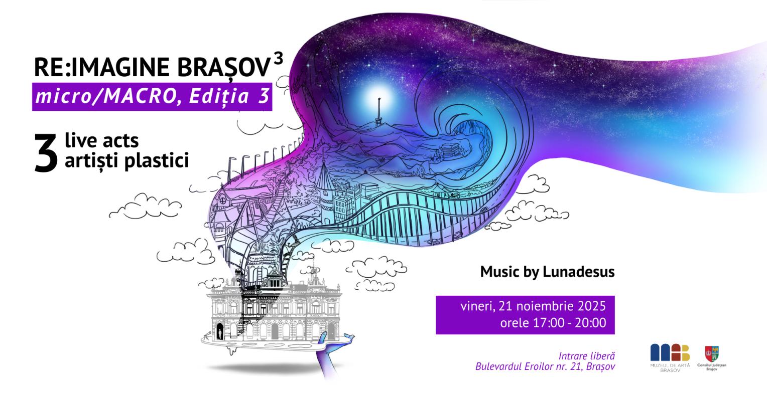 Al treilea și ultimul eveniment al acestui an din seria Re:Imagine Brașov – micro/MACRO va avea loc vineri, 21 noiembrie 2025, între orele 17:00- 20:00, la sediul Muzeului de Artă Brașov din Bulevardul Eroilor nr. 21. Sălile muzeului se vor transforma în spațiu de creație, atelier pentru artiști și cadru pentru discuții.